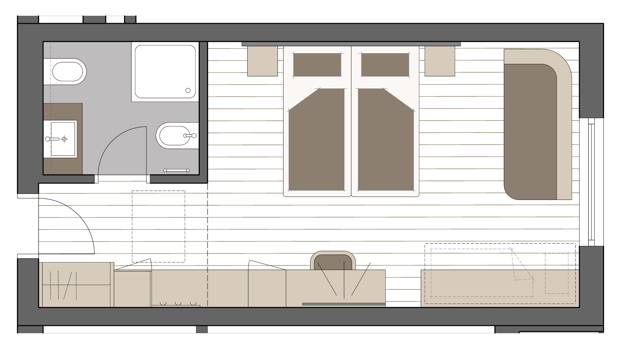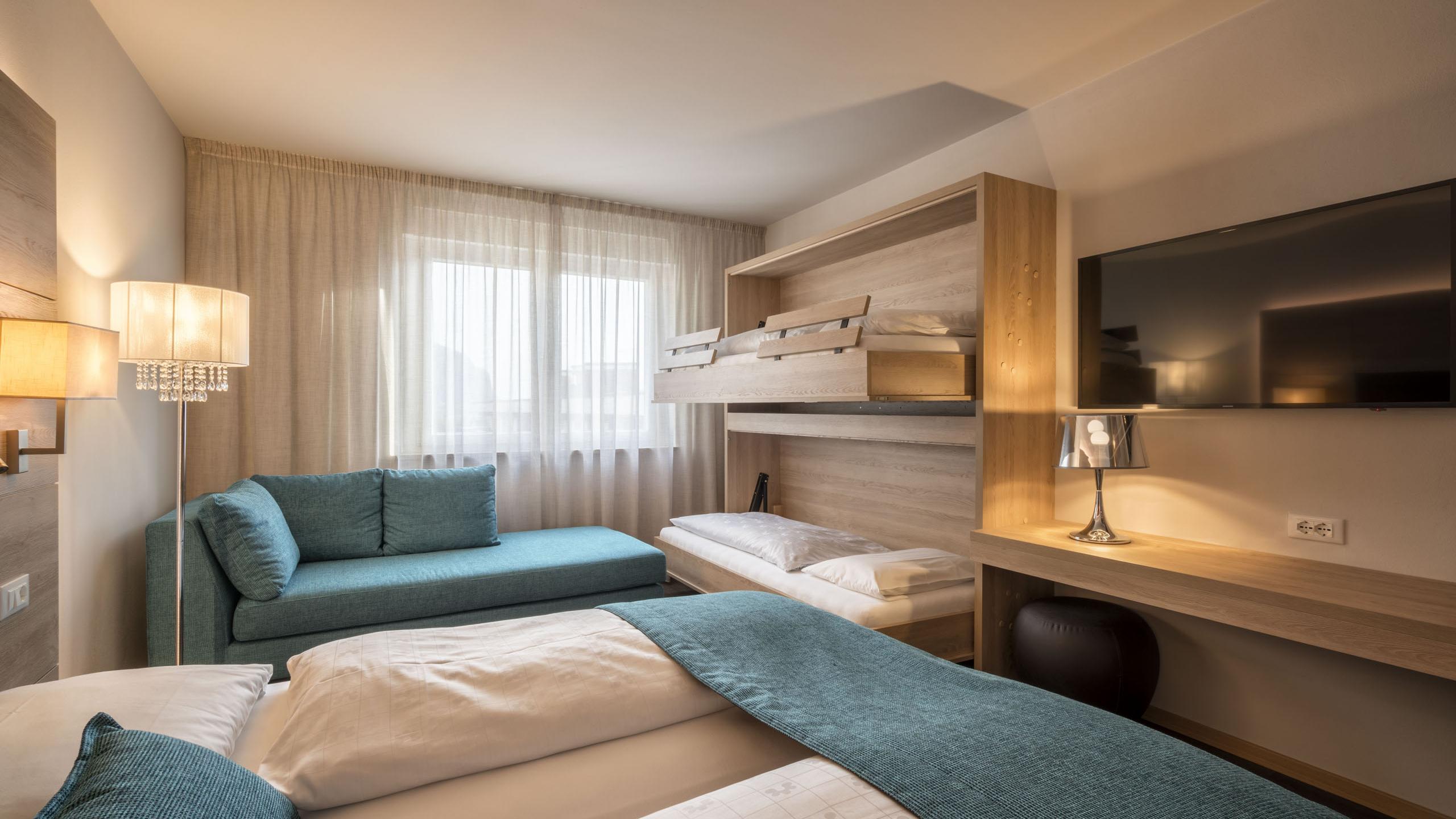 The standard room features simple yet modern furnishings and is located in the annexe (separate building which is connected to the main building via an underground corridor. There is no need to leave the building at any time, for example to reach the restaurant or the wellness area). With space for up to five people to sleep (double bed, bunk bed, and single sofa bed), it is an excellent solution for families with children. This room is not ideal for five adults.
