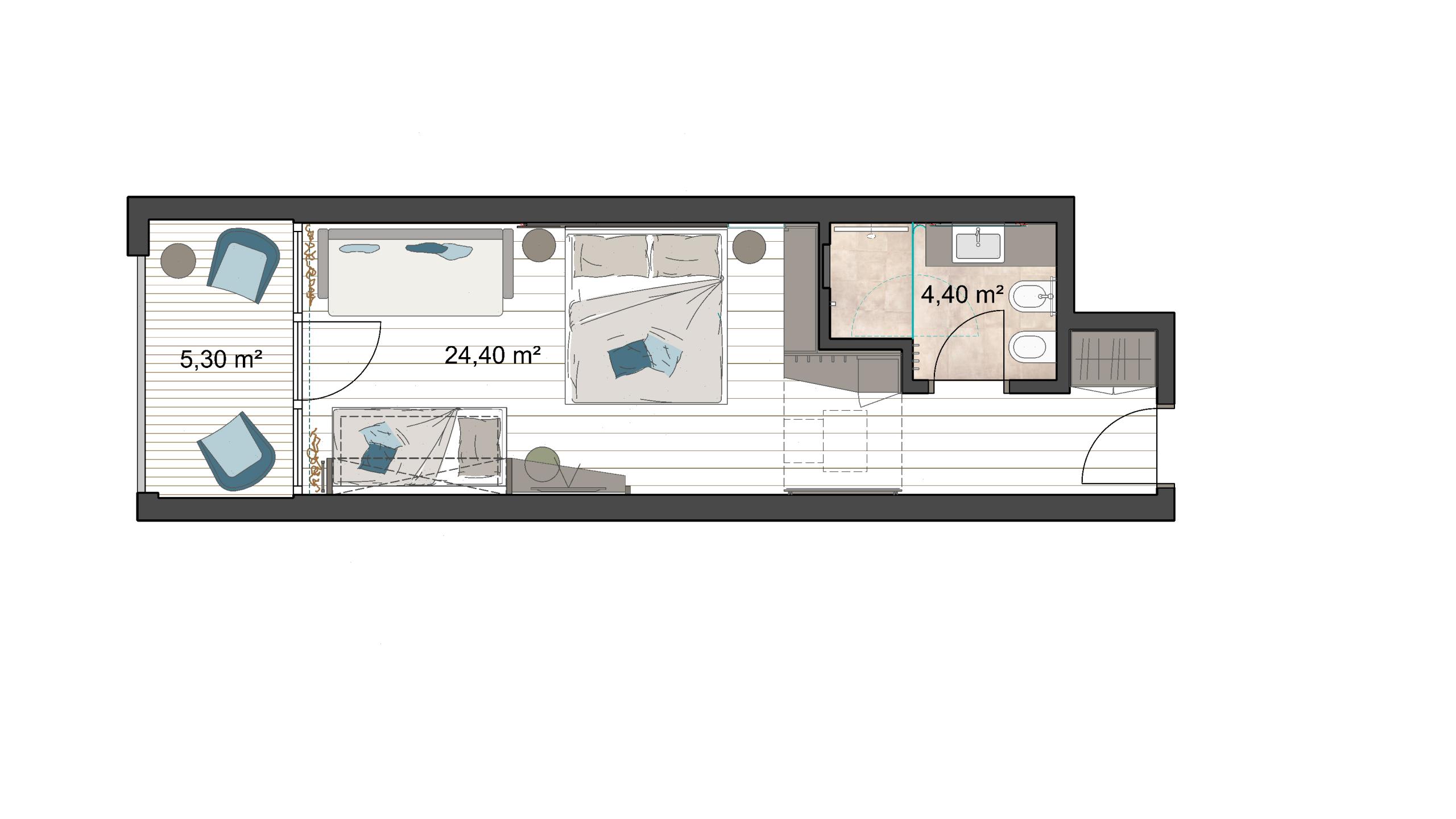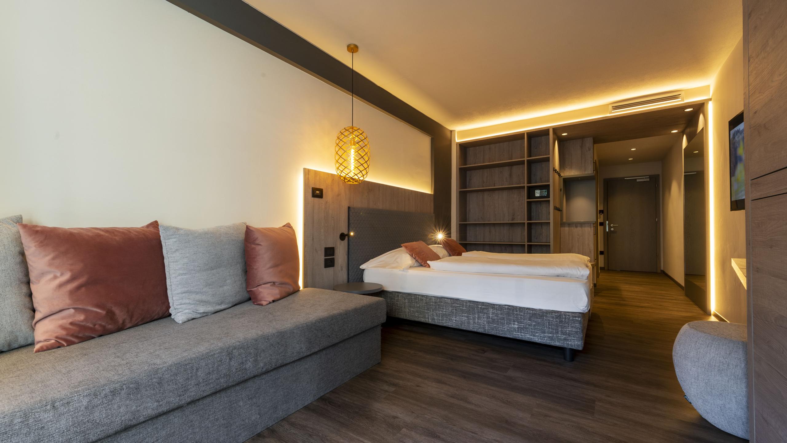 letto matrimoniale con materassi singoli, balcone con vista sul giardino interno, aria condizionata regolabile e riscaldamento, scrivania, divano, cassaforte, TV a schermo piatto, frigorifero (no minibar), pavimento in laminato, bagno moderno con WC, doccia a filo pavimento e bidet