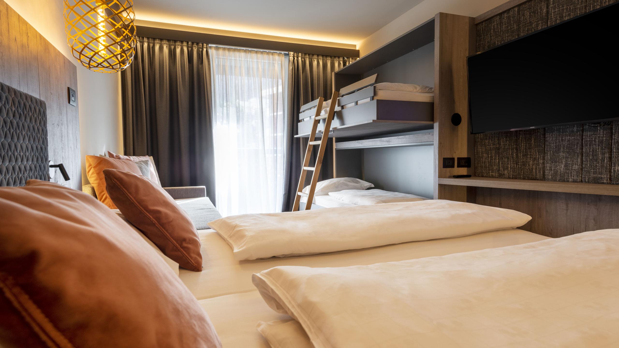 Das Deluxe-Zimmer ist modern ausgestattet, befindet sich im Hauptgebäude mit Ostausrichtung und Blick in den Innengarten und bietet die optimale Lösung für Familien mit bis zu fünf Schlafplätzen (Doppelbett, Stockbett und Einzelschlafcouch).