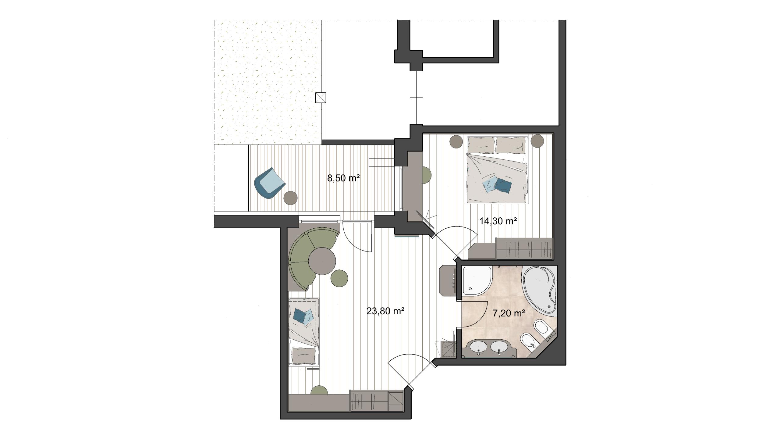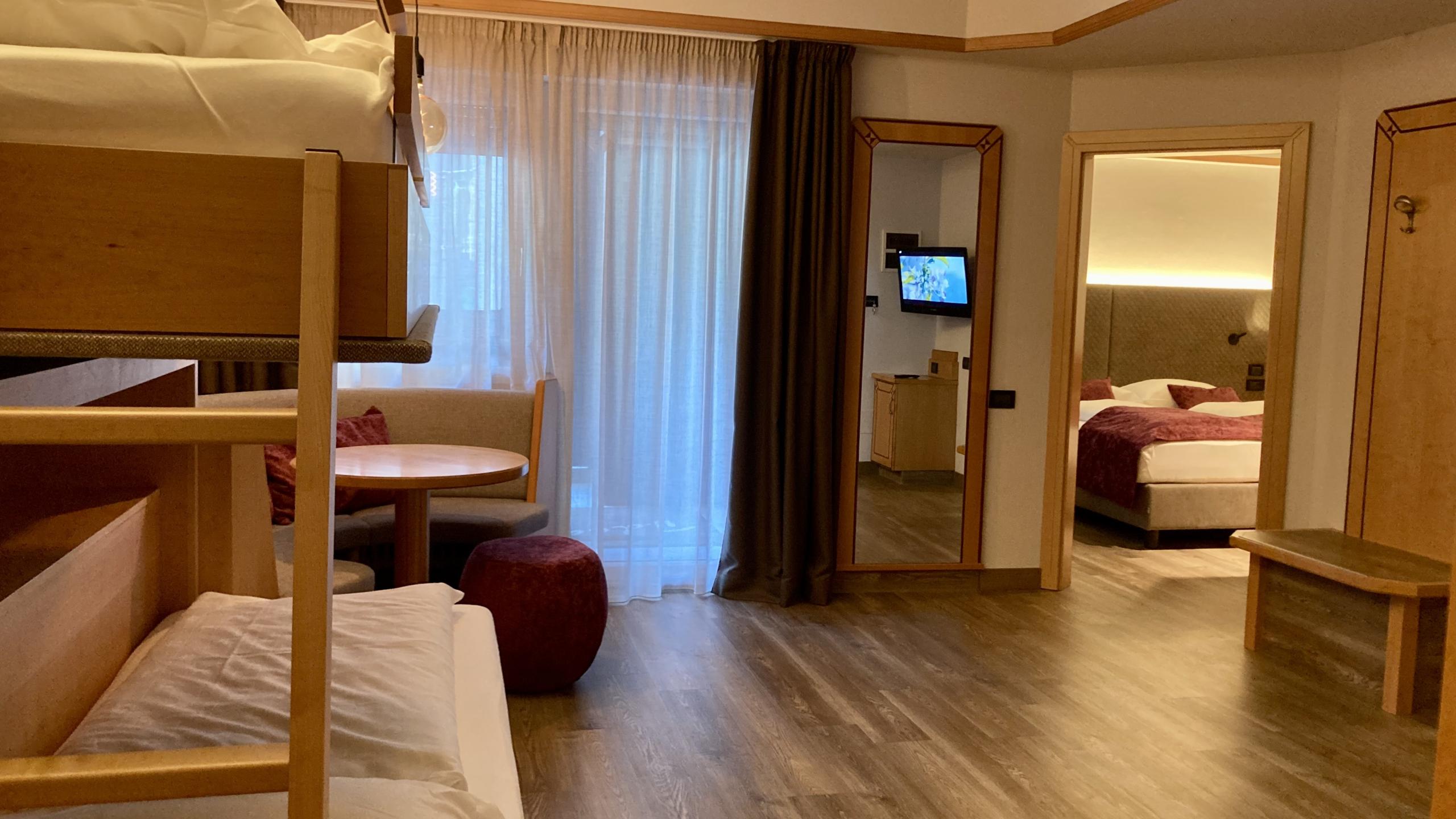 Das Superior-Zimmer ist großzügig ausgestattet, befindet sich im Haupthaus mit Ausrichtung nach Süden oder zum Innengarten und bietet die optimale Lösung für Familien mit bis zu fünf Schlafplätzen (Doppelbett, Stockbett und Einzelschlafcouch).